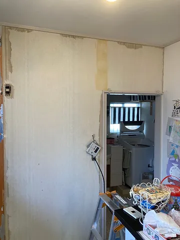 名取市の戸建住宅でクロス張替え工事 古いお家でもインテリアを楽しみたいとご相談いただき低予算でもできるアクセントクロスをご提案いたしました。既存下地に処理をして乾燥を待ちます。