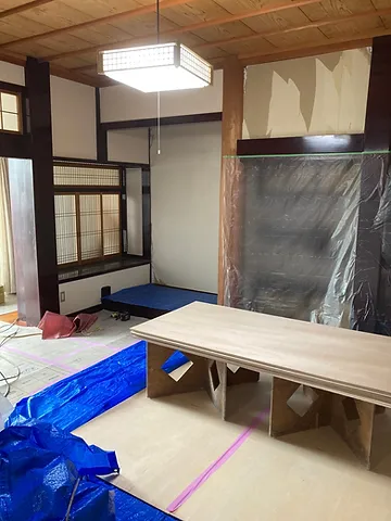亘理町で和室壁の補修工事 地震で壊れた壁下地を補修して和風調のクロスで仕上げます。