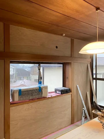 岩沼市で築40年の和室内装リフォーム工事 エアコンを外して砂壁に下地の合板を貼ります。