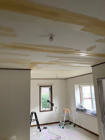 仙台市内でリビングの天井クロス張替え 木目柄のクロスを仕上げるので下地処理は丁寧により一層気を遣います。