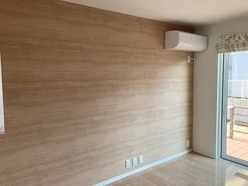 名取市の戸建て住宅で壁の亀裂補修工事 リビングの壁面に施主様こだわりの木目柄の壁紙をアクセントクロスで仕上げました。