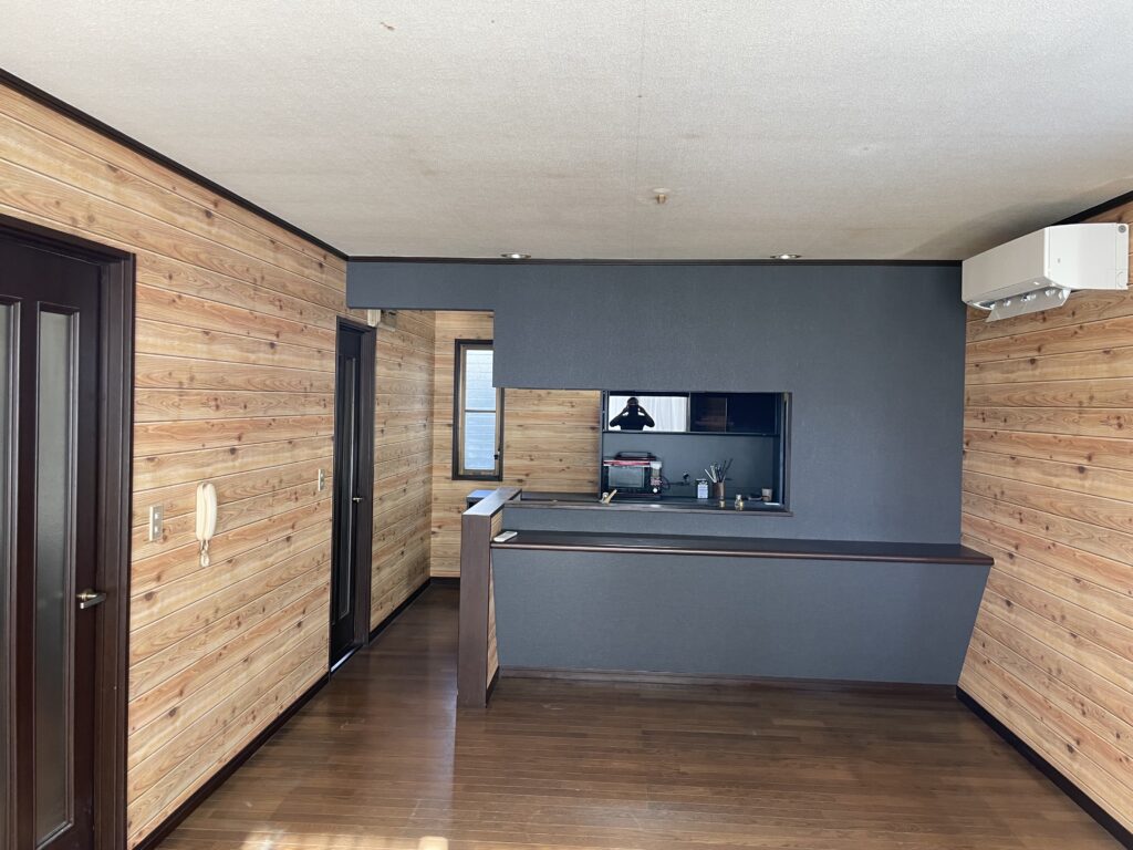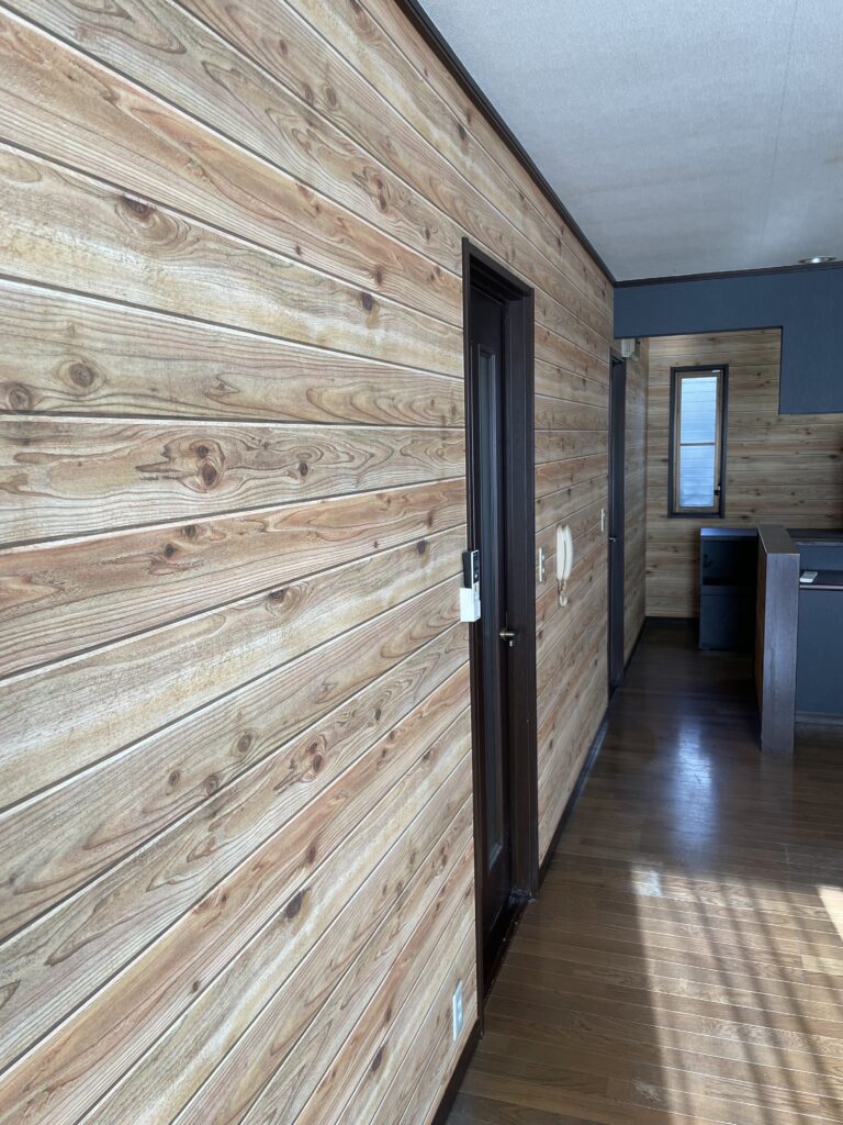 別荘のような山小屋風にしたいとご希望で羽目板調の壁紙を横貼りして仕上げました!