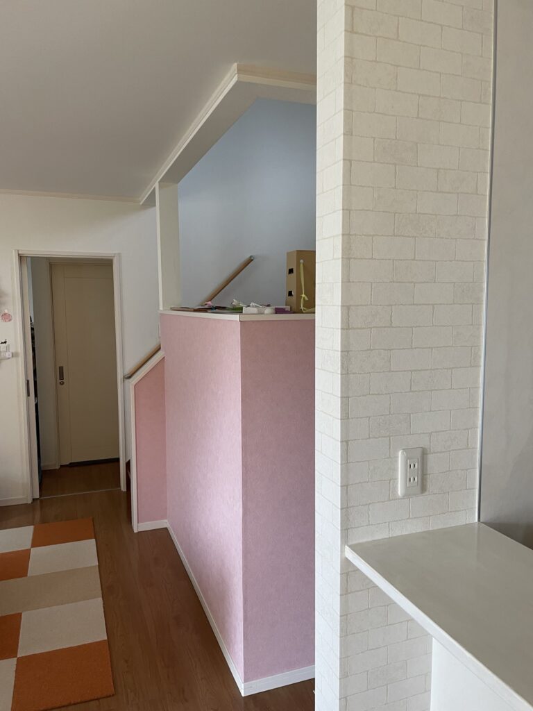 爽やかな印象の白レンガの壁紙とピンク系石目調の壁紙で張替え
